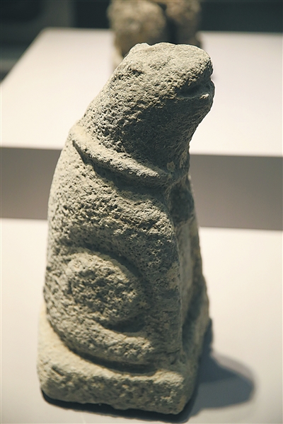 “夸张类型的石狗数量较多,从头部的形状看,有的方脸仰面朝天,咧嘴露牙形;有的圆头大眼,张嘴露舌形;有的面平脸圆,五官似线形等。”海南省博物馆策展人员贾世杰介绍,此类石狗从体态及饰物看,有蹲坐形,有匍匐形,有攻击形等,大部分身体上都饰以云雷纹、铜钱纹。从夸张变形的手法和程度看皆形态粗犷、手法简洁,注重神韵。