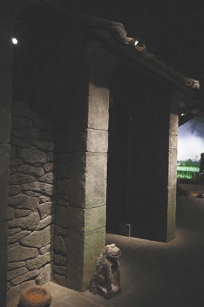 走进海南省博物馆的“仙凡之间——海南风情”陈列馆中,在一处琼北民居的布景中,可见一只石狗坐立于大门之前。这只石狗大小与真狗相仿,体态自然逼真,喙尖唇平、耳朵翘立,两条后腿蹲地,前腿直立,尾巴卷曲贴于后背。
