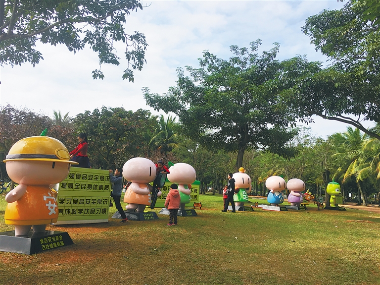 2月3日,海口阳光和煦,万绿园翠绿的草坪上游人如织,在草坪边上,一群卡通雕塑也引来市民的驻足、停留,不少孩子在其间玩耍嬉戏,这是用卡通雕塑组成的一个食药安全主题公园。伴随着这些活灵活现的卡通形象,食药安全得到了良好宣传,城市也增加了几分美丽。