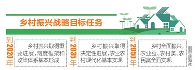 文件提出,走中国特色社会主义乡村振兴道路,让农业成为有奔头的产业,让农民成为有吸引力的职业,让农村成为安居乐业的美丽家园。文件确定了实施乡村振兴战略的目标任务:到2020年,乡村振兴取得重要进展,制度框架和政策体系基本形成;到2035年,乡村振兴取得决定性进展,农业农村现代化基本实现;到2050年,乡村全面振兴,农业强、农村美、农民富全面实现。