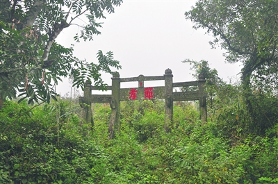 1月30日上午,海口地区冷雨绵绵。还未走进昌学村中,便在村外路旁看见一座四柱三间样式的牌坊。牌坊以火山石搭建而成,高约3米,宽约10米,面朝东北,上刻“节孝”两个大字,后人用红漆刷盖突出字体。