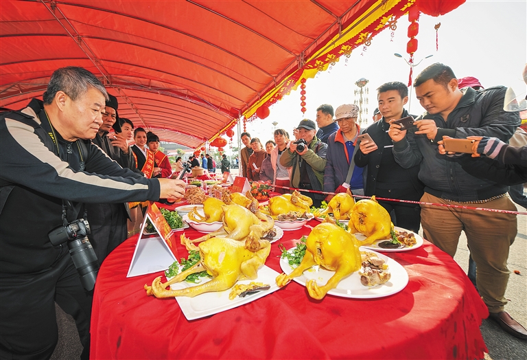 赛鸡阉(万宁当地对阉鸡的叫法)、挑坚果、备斋菜、写对联……春节临近,节庆氛围日益浓厚。2月4日,万宁首届“年味万宁”年货节暨万宁年鸡大赛在万城镇开幕。年鸡大赛作为当天的“重头戏”,格外受到关注。数十家参展单位,精心挑选出的鸡阉,被大家怀抱着,或者高举过头顶,不时对着围观的人群扑棱翅膀。