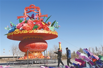 2月4日,工人从内蒙古巴彦淖尔市的彩灯制作现场走过。 春节临近,内蒙古巴彦淖尔市彩灯制作工人正加紧制作彩灯组,为当地举行的迎新年大型彩灯展做准备。 新华社发(支茂盛 摄)