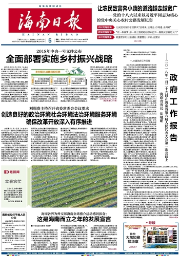 | 海南日报 头版 001 2018-02-051 2018年02月05日 星期一 |