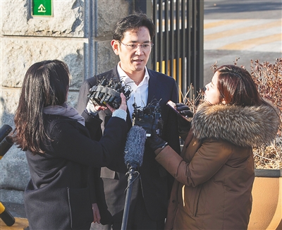 2月5日,韩国三星电子副会长李在镕(中)在位于韩国仪旺市的拘留所外接受记者采访。