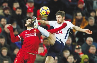 北京时间2月5日,在英超联赛第26轮比赛中,利物浦队主场以2∶2战平热刺队。图为利物浦队球员萨拉赫(左)在比赛中和热刺队球员本·戴维斯拼抢。新华社发