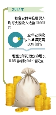 去年,我省坚持问题导向,实施多项促农增收举措,全年农民增收8.9%,超额完成年度目标任务。其中,农村居民收入下半年明显加速增长,各市县农民收入首次全部超过万元大关,贫困市县均实现两位数增长,四大项收入呈现“双稳双增”增长态势。