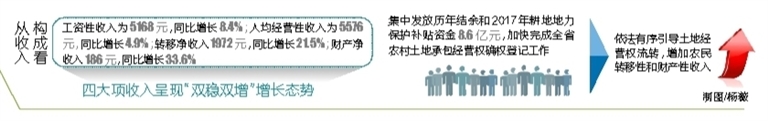 一方面,深入调整农业产业结构,推进农业提质增效,尤其是槟榔产业实现产业效益大幅提升,仅此一项就新增农民收入12亿元;同时,不断推动农业产业化、规模化发展,壮大乡村旅游产业,为农民提供更多的就业机会。另一方面,集中发放历年结余和2017年耕地地力保护补贴资金8.6亿元,加快完成全省农村土地承包经营权确权登记工作,依法有序引导土地经营权流转,增加农民转移性和财产性收入。此外,严格落实惠农支农政策,扎实推进特色产业精准扶贫,有效促进贫困户收入增长。
