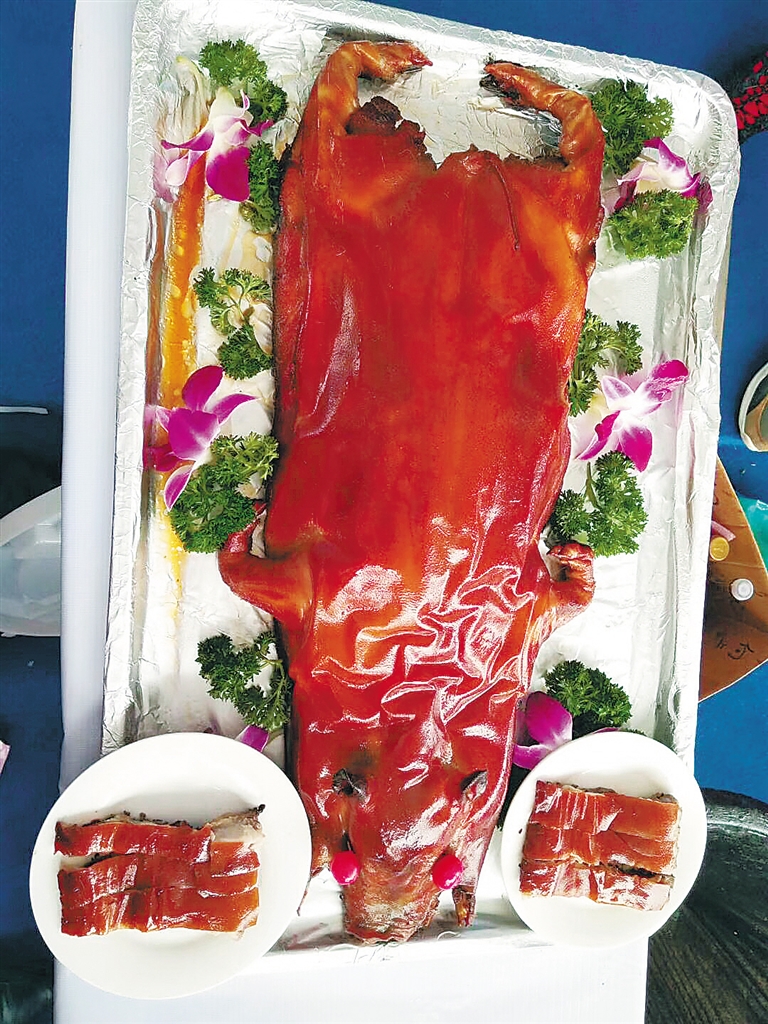 近日,笔者在五指山目睹了烤五脚猪的过程,并现场品尝。烤五脚猪色泽金黄,令人垂涎欲滴,口感滋润,肉质细密,口齿留香。