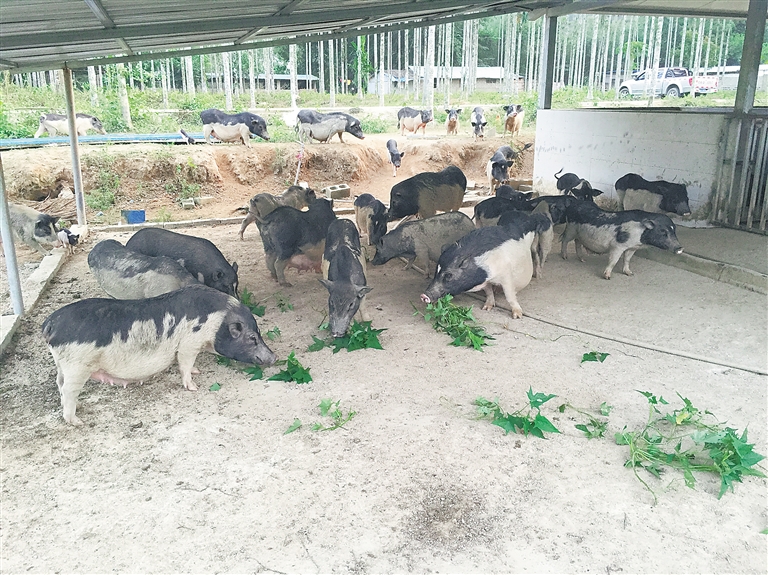近日,笔者来到位于番阳镇的省农林科技学校五指山五脚猪养殖基地,基地里养着1000多头五脚猪。该基地在培育五指山五脚猪产业,打造五指山五脚猪品牌的同时,也将当地的21户贫困户拉入企业,政府为每户购买10头猪苗交给公司,这21户村民被分为7组,每组来看护一周,每年保底有3000元收入。贫困村民陈越聪介绍说,以前在家也养猪,但是饲喂的时间不固定,而且次数多,导致养殖成本高,在这里,他不仅有年终分红收入,还学到了科学的养殖技术,他计划在技术学成后,回到家里自己养殖,并扩大养殖规模,通过养殖五指山五脚猪,实现脱贫致富。