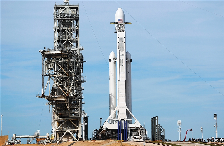 2月5日,在美国佛罗里达州肯尼迪航天中心,“猎鹰重型”火箭立在发射台上。 世界现役最强大的重型运载火箭“猎鹰重型”计划6日进行第一次试飞。美国太空探索技术公司首席执行官埃隆·马斯克5日说,火箭只要不在发射台上爆炸就意味着成功。 新华社/美联