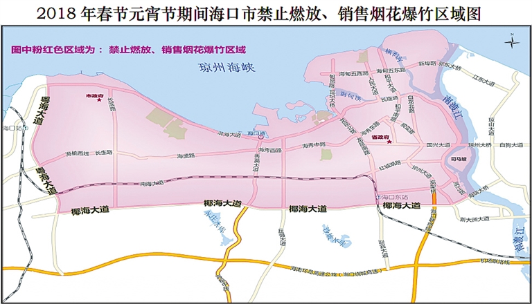 据了解,今年春节期间,海口以下区域禁止销售、燃放烟花爆竹:椰海大道以北,粤海大道以东,南渡江以西形成的闭合区域(含海甸岛、新埠岛和司马坡岛);国家机关、文物保护单位、学校、敬老院、医院、商场(市场)、宾馆(饭店)、体育馆、会堂、公共娱乐场所、机场、客运车站、码头、铁路沿线、加油站、液化石油气站、环境空气质量自动监测子站、输变电设施安全保护区,易燃易爆物品生产、储存单位等消防安全重点单位的场地及周边安全距离和山林防火区以内区域;法律法规禁止销售、燃放烟花爆竹的区域。