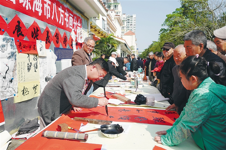 2月6日,琼海市八方书画分会在嘉积镇举办新春书画义卖送春联活动,来自全国各地“候鸟”书画家为当地群众送上新春的祝福。本报记者 王凯 摄