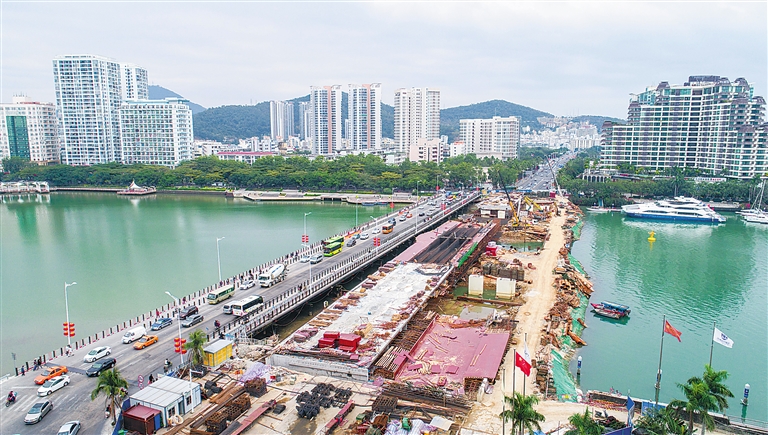 据悉,新三亚大桥全长246.86米,宽34.5米,建成后桥面将从原来的四车道增加到六车道,并增加非机动车道与人行道。新三亚大桥还增强了水面通航能力,达到最低通航7级的标准。目前,新三亚大桥已完成总工程量的74%,将力争于2018年上半年实现功能性通车。 本报记者 武威 摄
