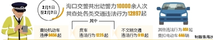 2月1日至2月7日,海口市交警支队共出动执勤警力10000余人次,共计查处各类交通违法行为12897起,其中查处机动车违停9456起、货车违法行为1225起、不文明交通违法行为919起、其他违法行为851起,查扣电动车446辆。