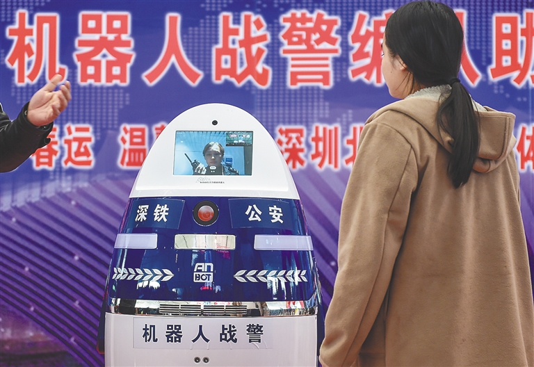 2月7日,工作人员演示通过警用机器人报警求助。当日,为加大对违法犯罪的打击力度,确保旅客出行安全,深圳铁路警方联合深圳市人工智能行业协会在深圳北站投入20台警用机器人,组成机器人警察编队,为春运保驾护航。这支“特殊”的安保队伍集众多功能于一身,不仅可以配合公安机关开展治安巡逻、监控报警,还能为旅客提供安全咨询、资讯播报和禁烟监督等服务。