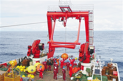 图为科考队员在布放潜标。 2月7日,我国新一代海洋综合科考船“科学”号在完成2017年西太平洋综合考察航次后,返回青岛西海岸新区的母港。科考队员在本航次成功建成我国首个深海实时科学观测网,西太平洋深海3000米范围内的温度、盐度和洋流等数据实现1小时1次实时传输。