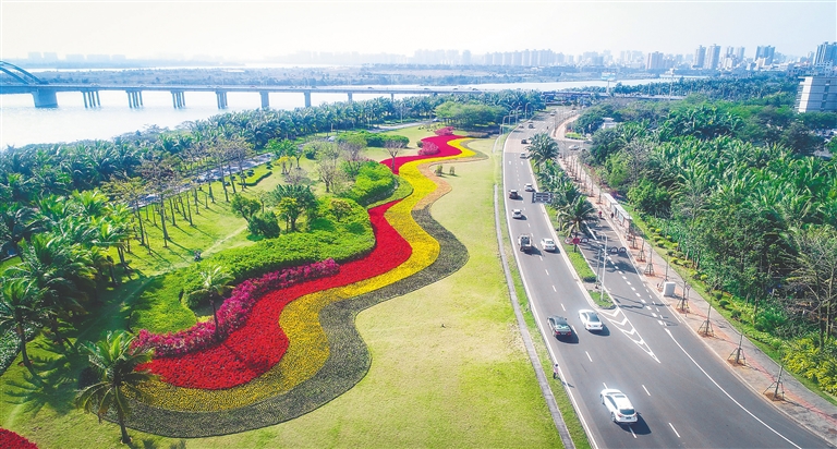 2月6日,在海口市滨江路,园林工人摆放上万盆鲜花形成一条蜿蜒绽放的花带,为椰城增添喜庆的节日色彩。据了解,为了喜迎新春佳节和海南建省办经济特区30周年,海口园林部门陆续在海口滨江路、龙昆南路、国兴大道、滨海大道、椰海大道等5条主干道摆放了45万余盆花卉植物。本报记者 张茂 摄