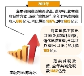 据悉,2018年海南国税将积极推进“党建强税”“数据管税”“人才兴税”三大战略,建设电子税务局,整合现有互联网办税资源,逐步实现互联网涉税业务的整体云化,培养大数据集成与分析,形成纳税人“需求服务图谱”,集中数据分析、管理、增值应用优势,推进税收管理科学化,持续提升纳税服务。同时,聚力创新,提高税收征管质效,积极发挥税收政策的杠杆作用,更好地为经济社会发展服务,为推动美好新海南建设作出更大贡献。