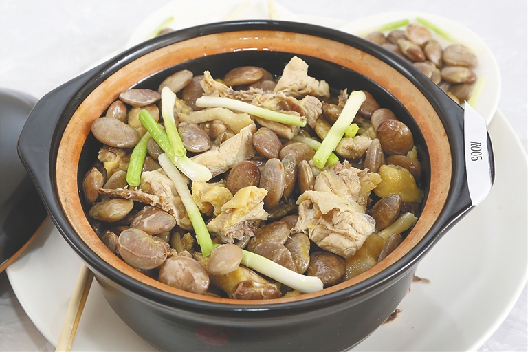 板栗阉鸡煲,以儋州鸡和板栗为主食材,通过新颖的烹调方法使两者原料营养更加融和,味美清香,口感层次感强。