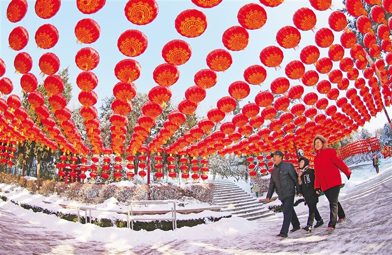 2月8日,在山东省烟台市毓璜顶公园,游人从红灯笼下走过。当日是农历腊月廿三,我国民间俗称的“小年”,各地张灯结彩,年味渐浓。 新华社发