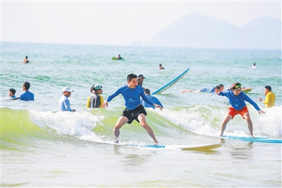 国家旅游局、国家体育总局印发的《关于大力发展体育旅游的指导意见》指出,体育是发展旅游产业的重要资源,旅游是推进体育产业的重要动力。“体育+旅游”正是海南亲水运动季的突出亮点,许多亲水赛事活动选择在涉水景区举行,如海口假日海滩、文昌高隆湾、琼海博鳌玉带滩、万宁日月湾、陵水清水湾、三亚蜈支洲岛等。