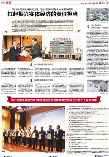 海口国家高新区2017年度科技进步与提质增效优秀企业和个人获奖名单
