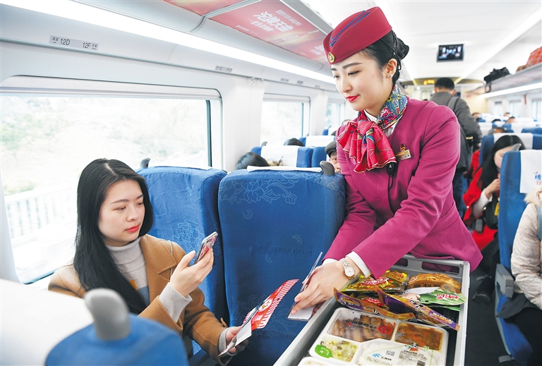 据了解,因为购买方便快捷、品种多样,网上订餐的旅客越来越多。点餐量加大后,如何及时把餐食送到旅客手中,是目前一个比较大的考验。G2次列车服务员陈楠说:“列车停靠站只有两三分钟,我们是在指定地点领取餐食后再送上车的。停靠时间短加上春运期间客流量大,给送餐服务提出了更高要求。”