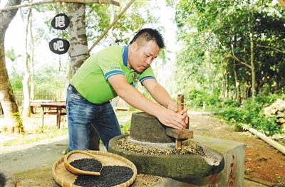 记者来到王和山家时,他正手持一把约三尺长的大铁勺,探入锅中反复搅动,豆浆四溢的醇香勾来不少馋嘴的小孩。边张罗着给孩子们分豆浆,王和山边回头介绍道:“可别小瞧了我们这黑豆腐,制作起来总共需耗时3天,原料还得是我们当地‘世代相传’的小种黑豆。”