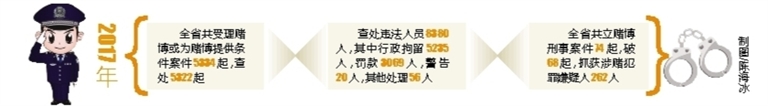 据了解,2017年,全省各级公安机关按照公安部的部署,对涉赌违法犯罪始终保持“零容忍”,不断创新机制、完善打法,深入开展“断链”专项行动,依法严厉打击整治赌博违法犯罪活动。