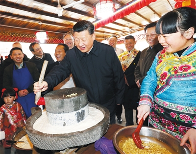 不远处的博爱新村饭店正忙着准备午餐。习近平来到店前,关切询问生意好不好,一年能挣多少钱。店主杨云刚向总书记汇报,托党的福,小店旺季淡季客人都不少,收入养活全家6口人还有富余。习近平听后很高兴。在主人邀请下,他愉快地参与炸酥肉、磨豆花,边体验边同一家人交流,一幅其乐融融的场景。习近平同闻讯赶来的居民群众亲切交谈,祝大家在用勤劳双手建设美好生活上取得更大成绩。