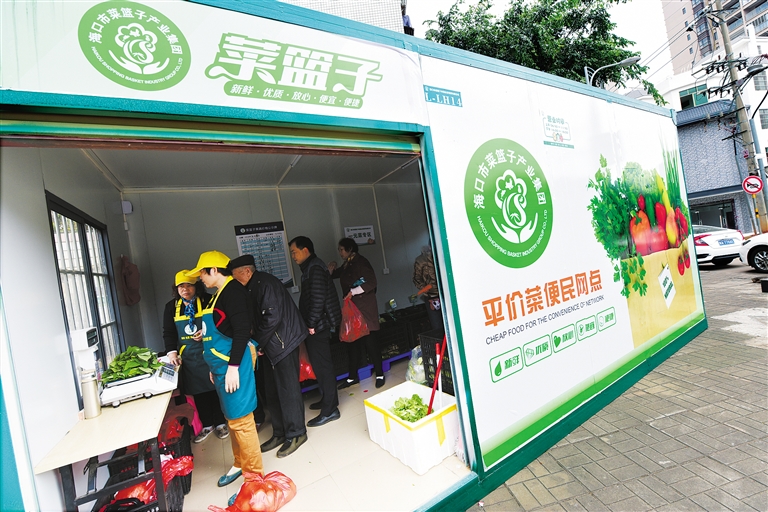 位于海口碧湖家园东区空地,一个由集装箱改装而成的店铺,挂着“平价菜便民网点”的牌子。一早开始,这里进进出出的人流就络绎不绝。
