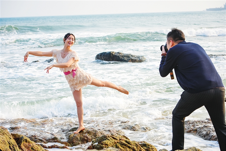 近日,在万宁日月湾,一名女游客站在礁石上摆好姿势让友人拍下自己和海浪的合影。