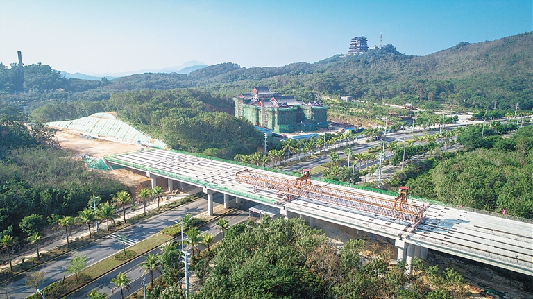 万洋高速公路连接儋州市区西延主干道的高架桥日前顺利完工。据了解,该桥全长666.4米,全桥位于路线曲线段内,由南向北纵跨儋州市区。 特约记者 吴文生 摄