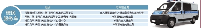 据了解,2月15日至21日春节黄金周期间,每天的9时至11时30分、15时至17时,海口警方将在东环高铁海口东站站前广场、明珠广场、日月广场、秀英港、新海港、南港、滨江路与美祥路交叉口(和风江岸小区旁)、万绿园南门等8个地点设置便民服务车。其中,可提供出入境管理业务、户政业务咨询和宣传引导的有万绿园南门、明珠广场、日月广场、和风江岸小区等4个服务点;可办理车驾管违法处理业务的有明珠广场、日月广场、和风江岸小区、新海港、秀英港5个服务点;其余便民服务车均可提供交通管理业务咨询、宣传、引导等服务。