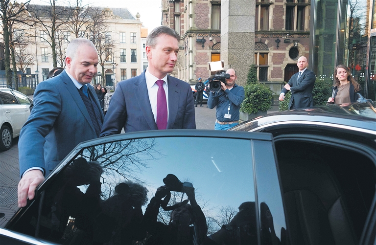 2月13日,在荷兰海牙,荷兰外交大臣泽尔斯特拉(左二)宣布辞职后离开议会二院。 泽尔斯特拉13日宣布引咎辞职,原因是他曾发表的涉及俄罗斯总统普京的言论里包含捏造和曲解成分。 新华社/法新