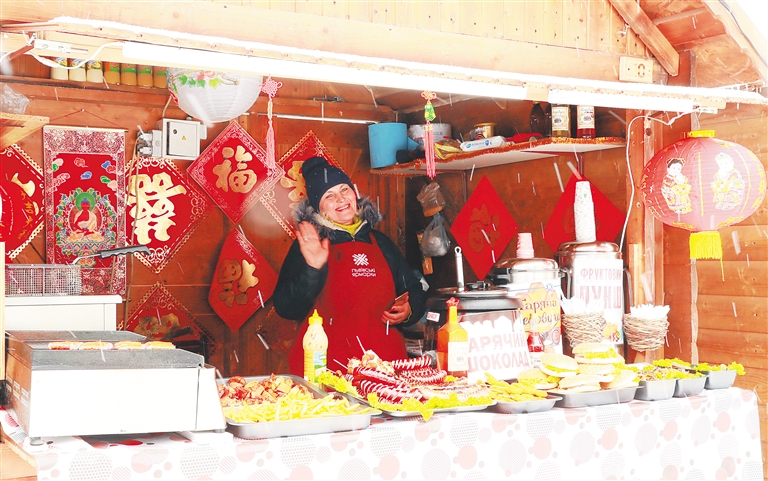 2月15日,乌克兰西部城市利沃夫在市政厅广场举行欢度中国春节活动。在利沃夫市政厅广场,一名女子在小商铺准备迎接前来参加活动的顾客。新华社记者 陈俊锋 摄