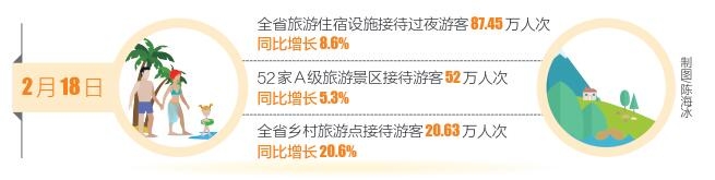 2月18日,全省旅游住宿设施接待过夜游客87.45万人次,同比增长8.6%,过夜游客旅游收入18.8亿元,同比增长12.3%。52家A级旅游景区接待游客52万人次,同比增长5.3%,门票收入2470万元,同比增长12.2%。全省乡村旅游点接待游客20.63万人次,同比增长20.6%,乡村旅游收入2919万元,同比增长91.4%。两家免税购物店及万宁首创奥特莱斯购物总人数67293人次,同比增长16%,购物销售额8150.07万元,同比增长32.6%。