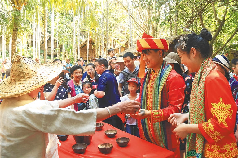 2月18日,游客在槟榔谷景区体验黎族传统婚俗。本报记者 武威 通讯员 潘达强 摄