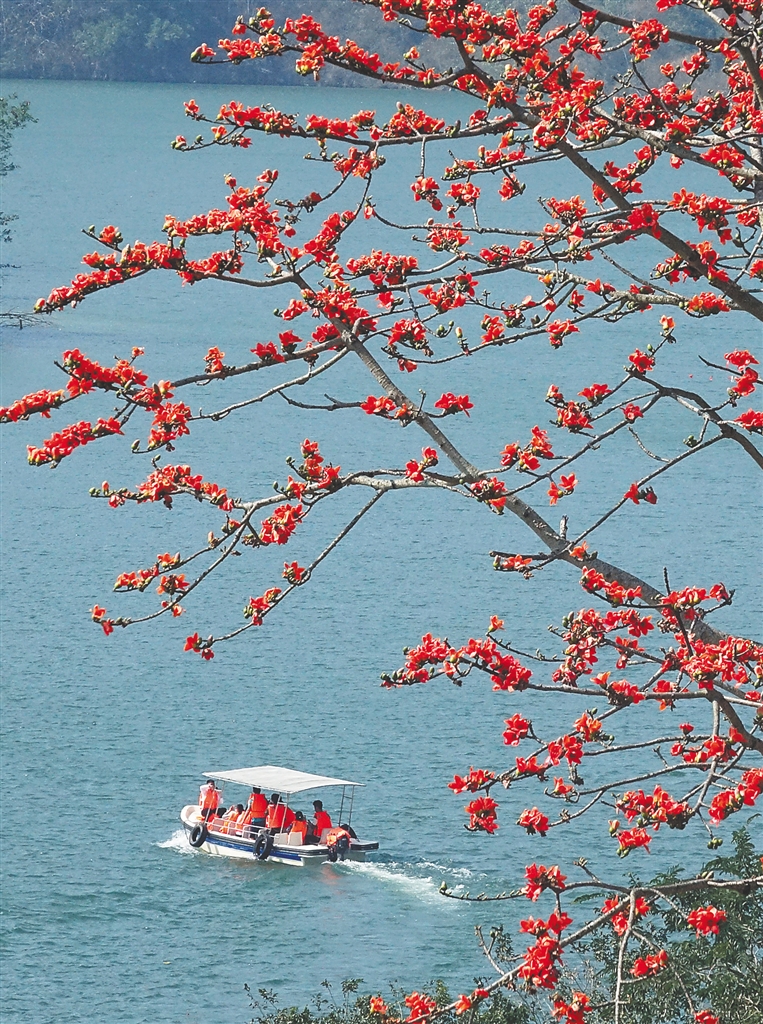 春节期间,各地游客到昌江昌化江畔赏木棉美景。本报记者 李英挺 摄