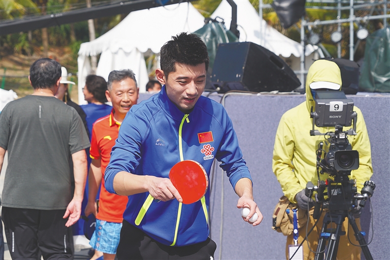 “有没有信心战胜张继科?”“有!”三亚11岁男孩小罗手拿乒乓球拍,自信地回应主持人。正月初三下午,奥运冠军张继科助阵体育庙会,与100名乒乓球爱好者一一对战,拉开“战胜懒癌·以一敌百”的刺激对抗赛,现场市民游客的热情被迅速点燃。