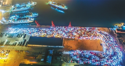 2月21日22时许,在海口市秀英港码头,滞留车辆有序离港。 本报记者 张茂 摄