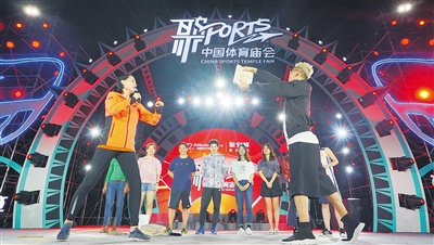 2月21日,跆拳道奥运冠军吴静钰在体育庙会现场,与游客一起进行运动游戏互动。 本报记者 武威 摄