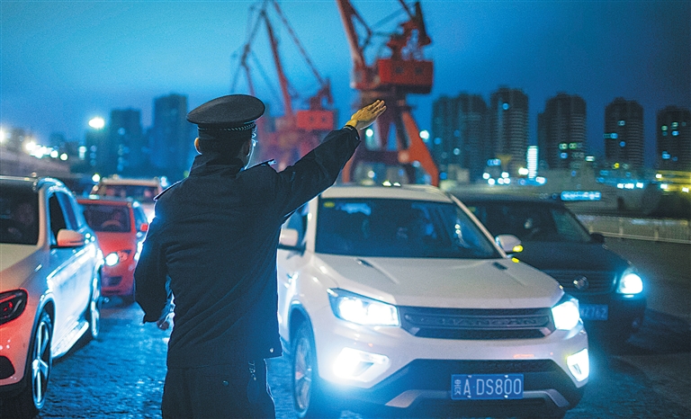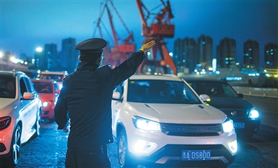 ② 2月22日傍晚,海口港区内,一名警察坚守岗位,指挥过海车辆有序排队进入待渡区。 本报记者 宋国强 摄