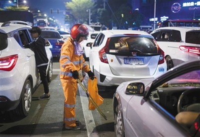 在这条爱心涌动的大道上,还有不少和吴丽强一样的环卫工人,一边收集垃圾,一边向排队过海的车队提供服务。