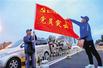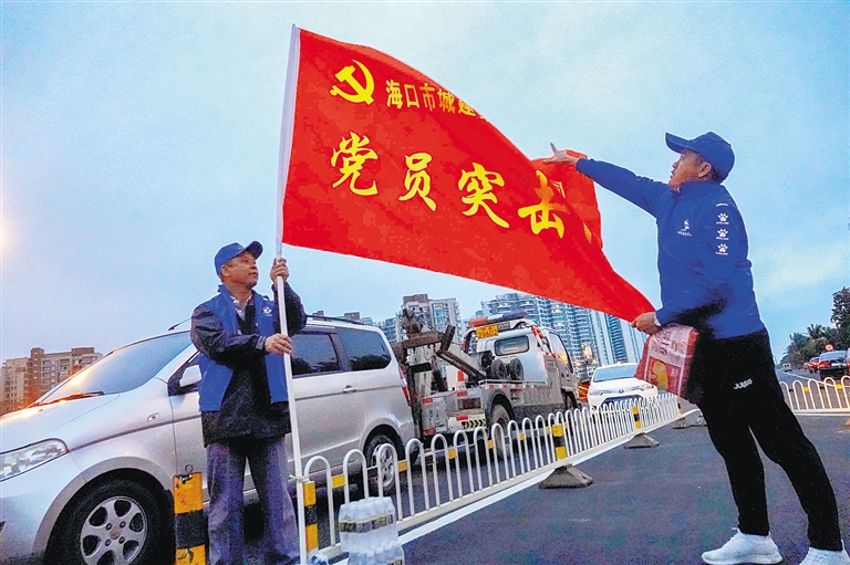 2月22日傍晚,海口城建集团的党员突击队来到新海港附近服务旅客。 本报记者 陈元才 摄