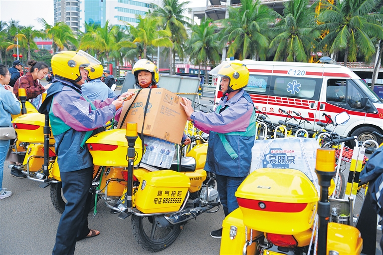 2月22日,海口市滨海大道秀英港出口处,民生燃气公司的抢险摩托车队正在帮忙运送食品、矿泉水等物资。本报记者 王凯 摄