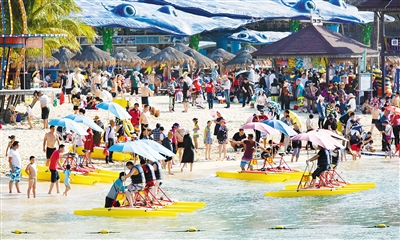 春节黄金周期间,大批游客在陵水黎族自治县分界洲岛景区海滩休闲游玩。