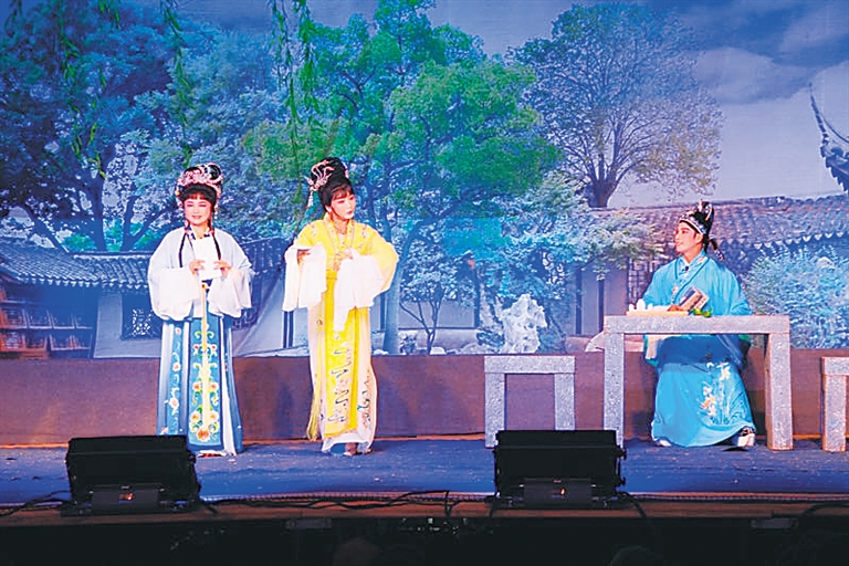 戏台上,一场精彩的琼剧正在上演。身着粉蓝衣裙的曼妙女子,手拿手帕,三寸金莲步慢慢走向台中央。一扬眉、一甩袖、一挪步,溪水般清澈的曲调从她口中流淌而出。她唱道:“东风一夜春如绣,雨露添花竟日游……”