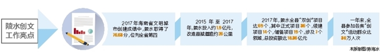 数据显示,2017年,陵水全县“双创”项目达69个,其中正式项目36个、续建项目14个、储备项目19个,涉及市政道路升级改造、水体治理、环卫设施、园林景观绿化、立面改造、综合工程和其他项目等7个领域,总投资额达18.36亿元。